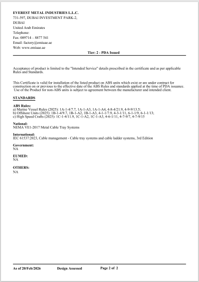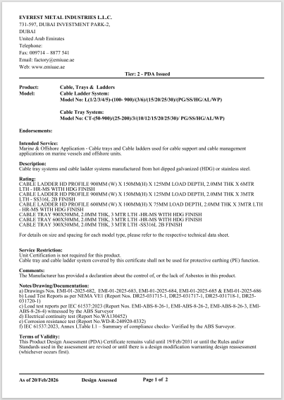 Everest Metal Industries LLC has successfully obtained Type Approval / Product Design Assessment (PDA) from the American Bureau of Shipping (ABS).